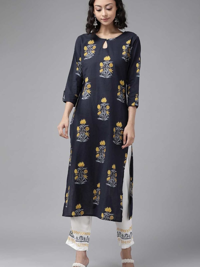 Pure Cotton Floral Block Printed Ready to Wear Kurta Set in Blue