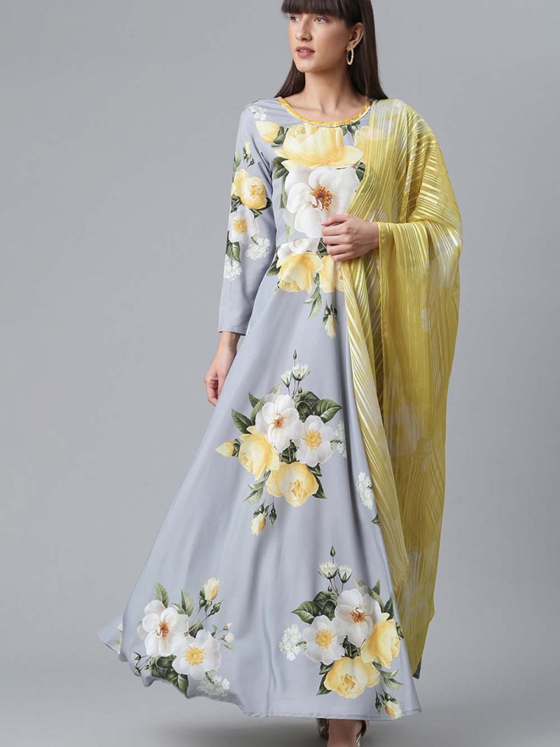 Rayon Grey Digital Print Kurta With Dupatta Set
