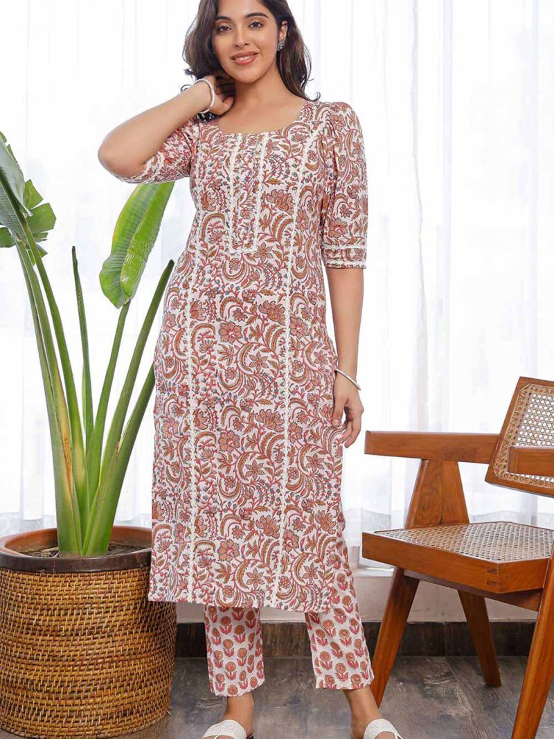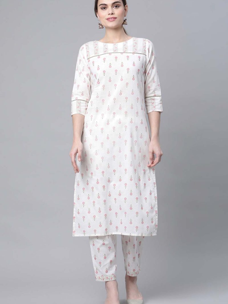Off White Colour Pure Cotton Printed Kurta Pant Set