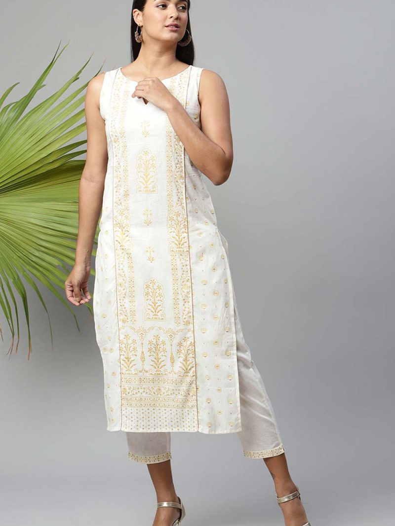 Original price was: $75.90.$49.00Current price is: $49.00.womens-off-white-pure-cotton-printed-kurta-pant-set-ahkupn-combo-528