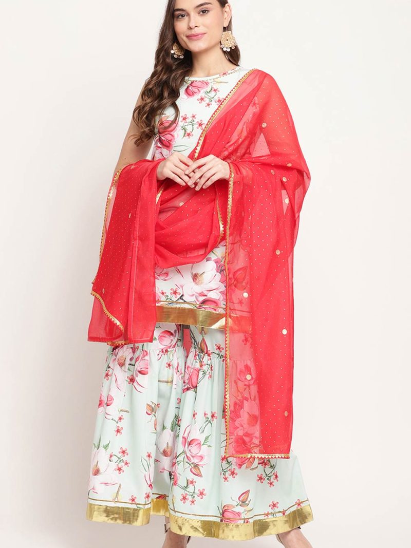 Women Mint Green Crepe Digital Floral Print Kurta Sharara Set With Dupatta
