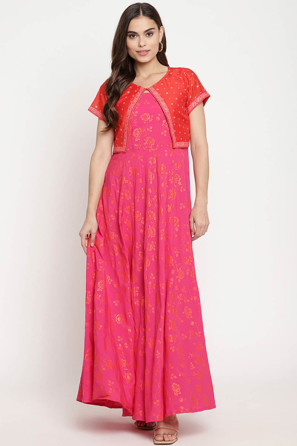 Kurti design: Floral printed. Sraight shape.Regular style.Boat neck. sleeveless no sleeves. 1 pockets gotta patti detail.Above knee length with straight hem.Poly crepe machine weave fabric.