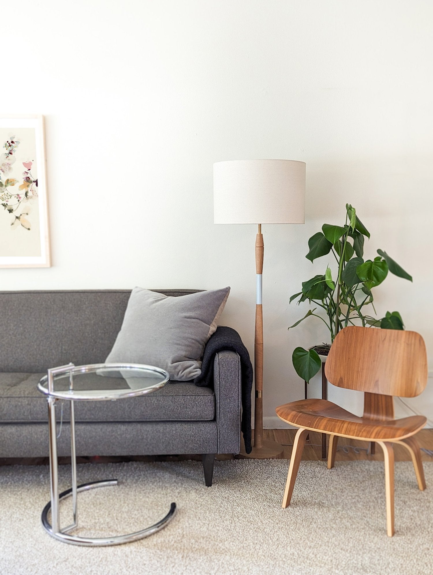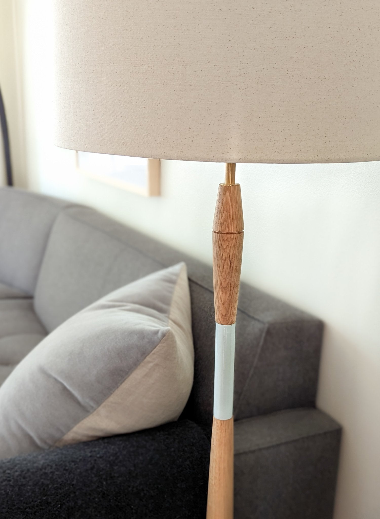 Made of oak, stoneware, and brass. One of our early floor lamp designs!