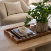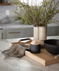 Made from solid hardwood and featuring ceramic handles and brass hardware.