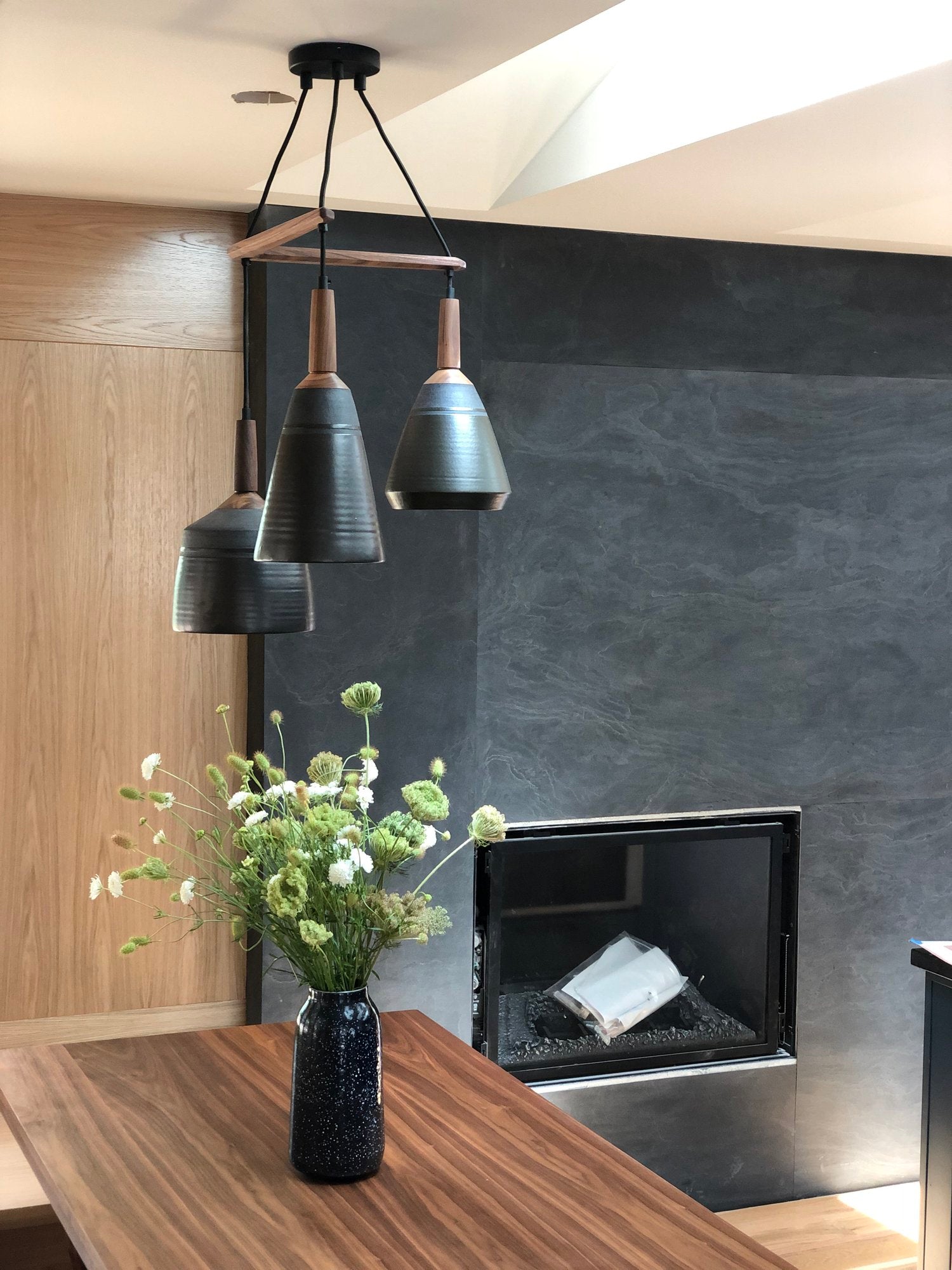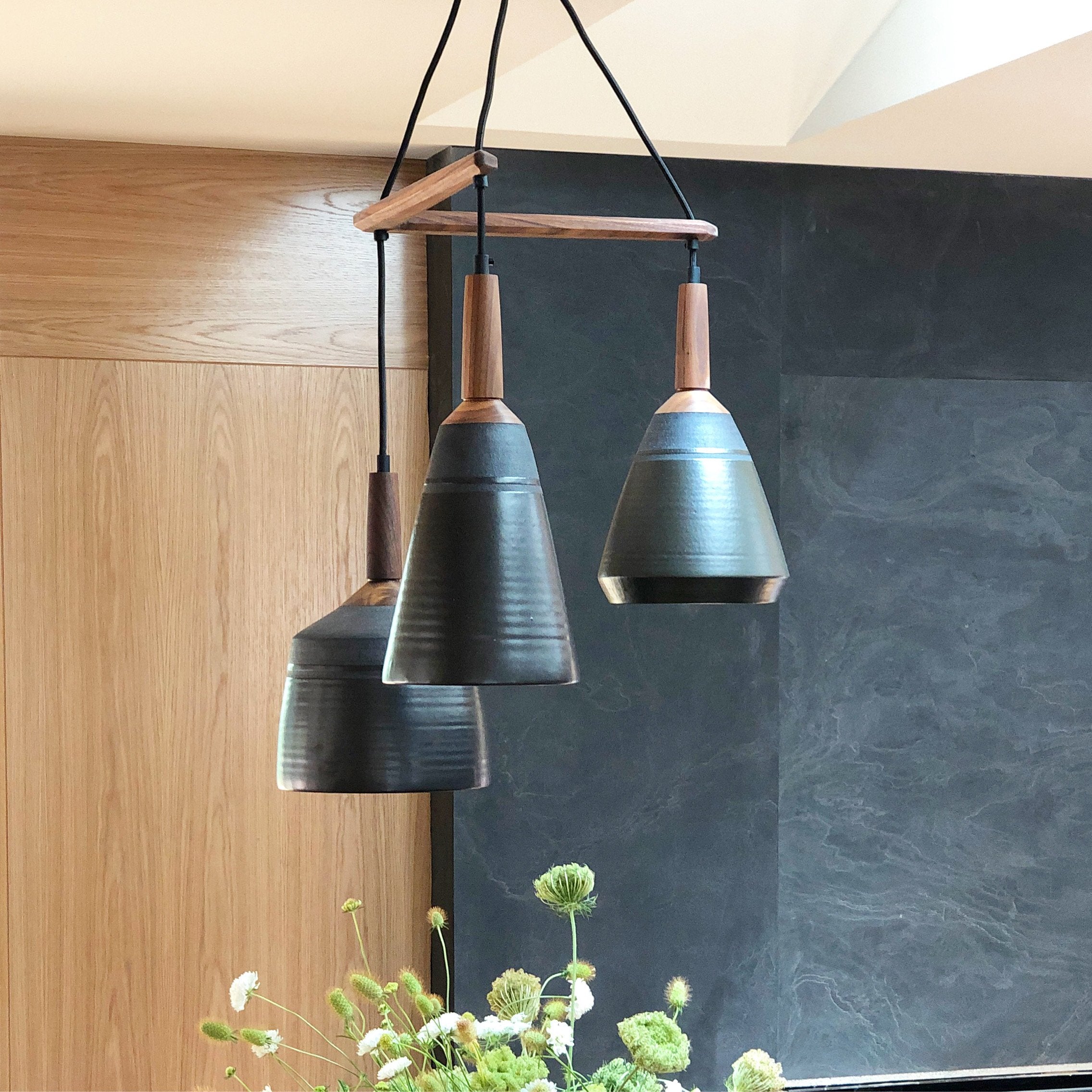 A large lighting fixture, ideal to hang over a dining table or living area. Handmade walnut boomerang hanger gives this piece the perfect spacing and scale.