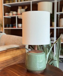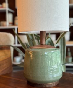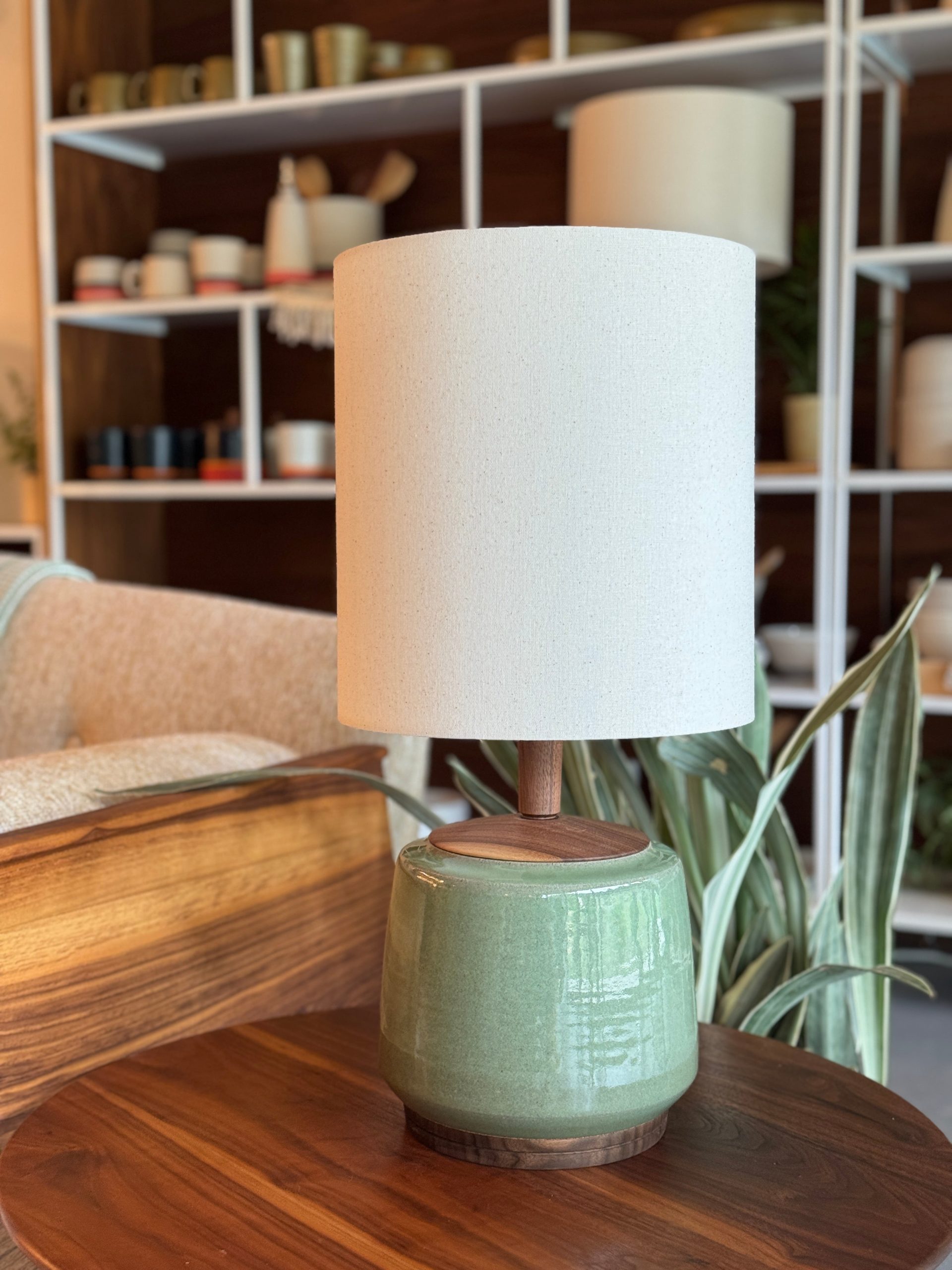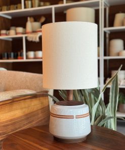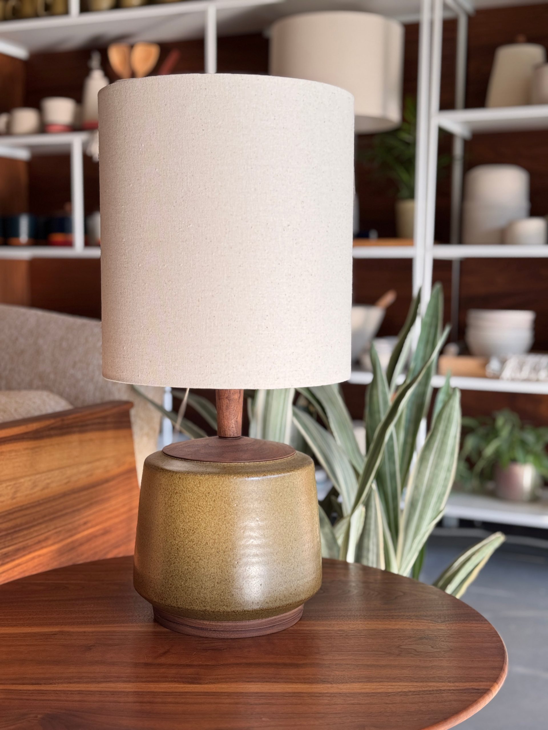 The perfect mid century lamp for a desk, side table, or console. This lamp style has quickly become one of our very favorites. Particularly, the angled woodworking, which echoes back to the atomic design days of the 50’s and 60’s. The combination of the squatty ceramic body and wooden neck feels the most reminiscent of that period.