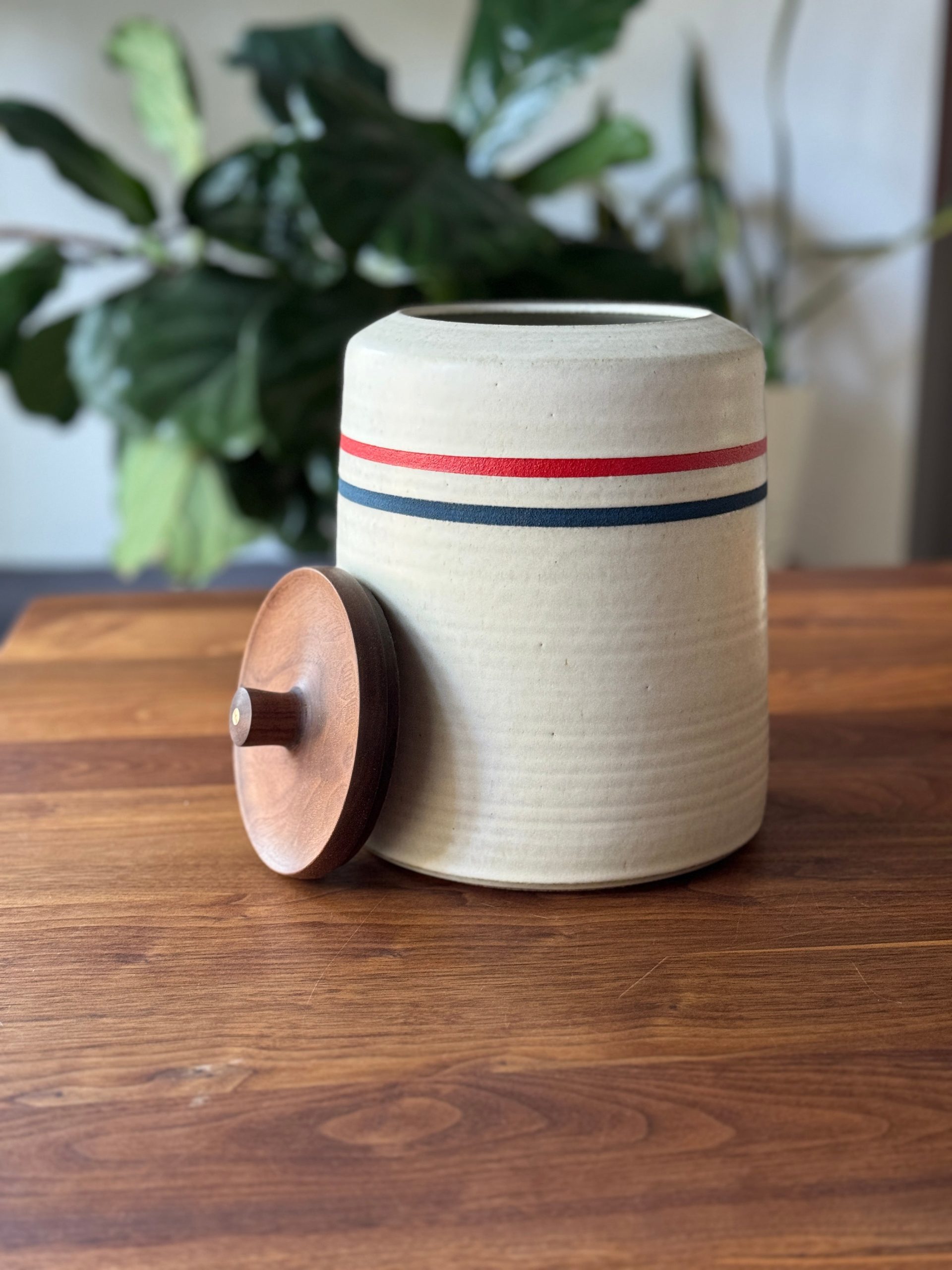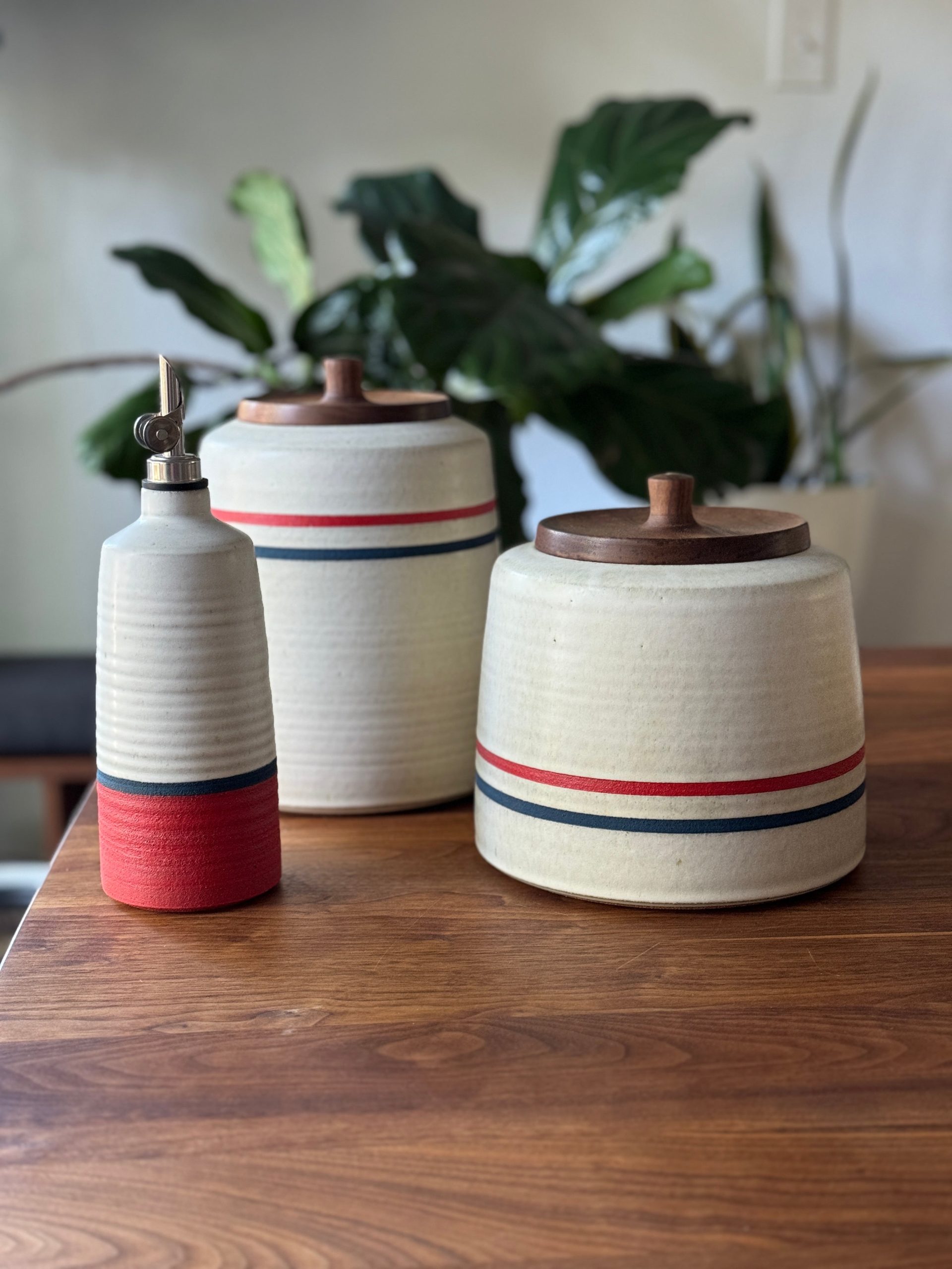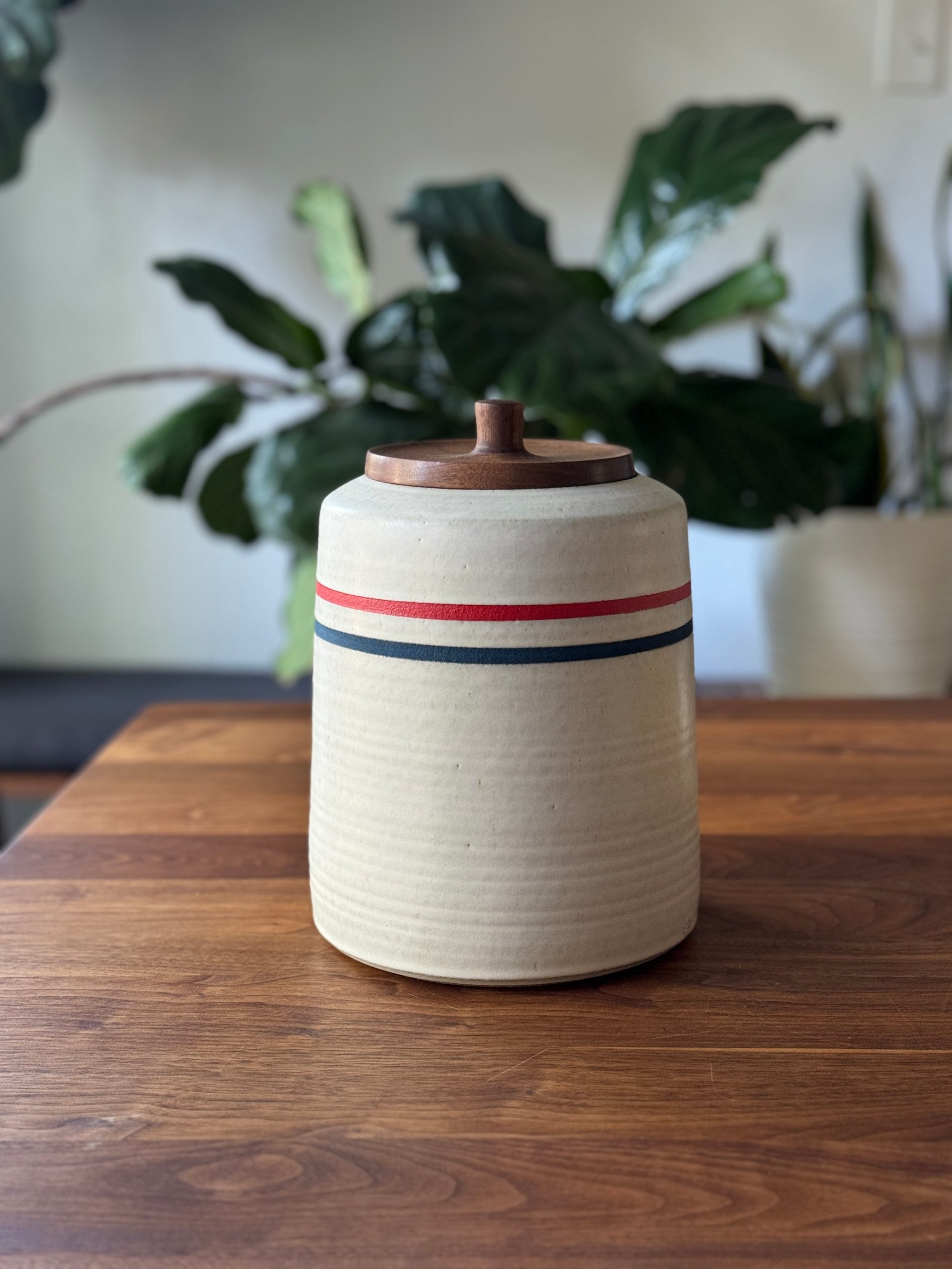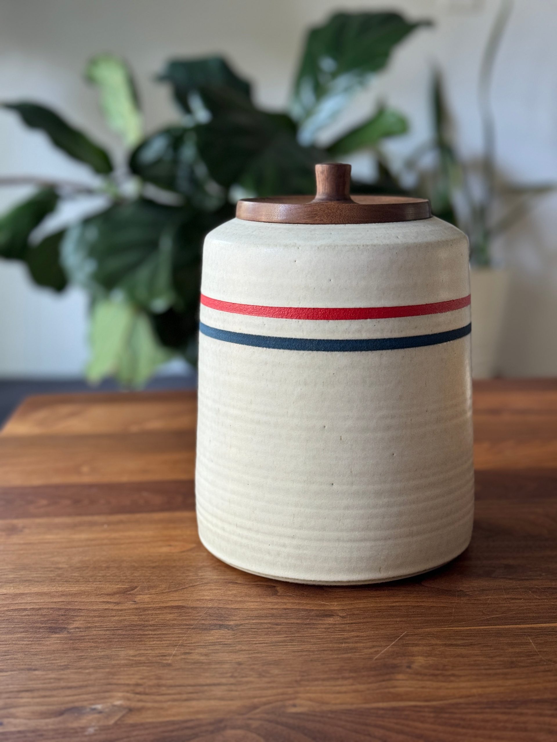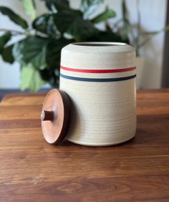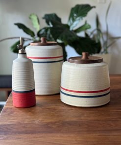 With bold stripes and large size, this canister is ideal for storing dry goods in the kitchen or stashing things away on open shelves or any other space in the home.