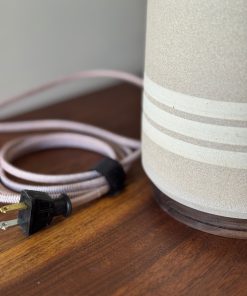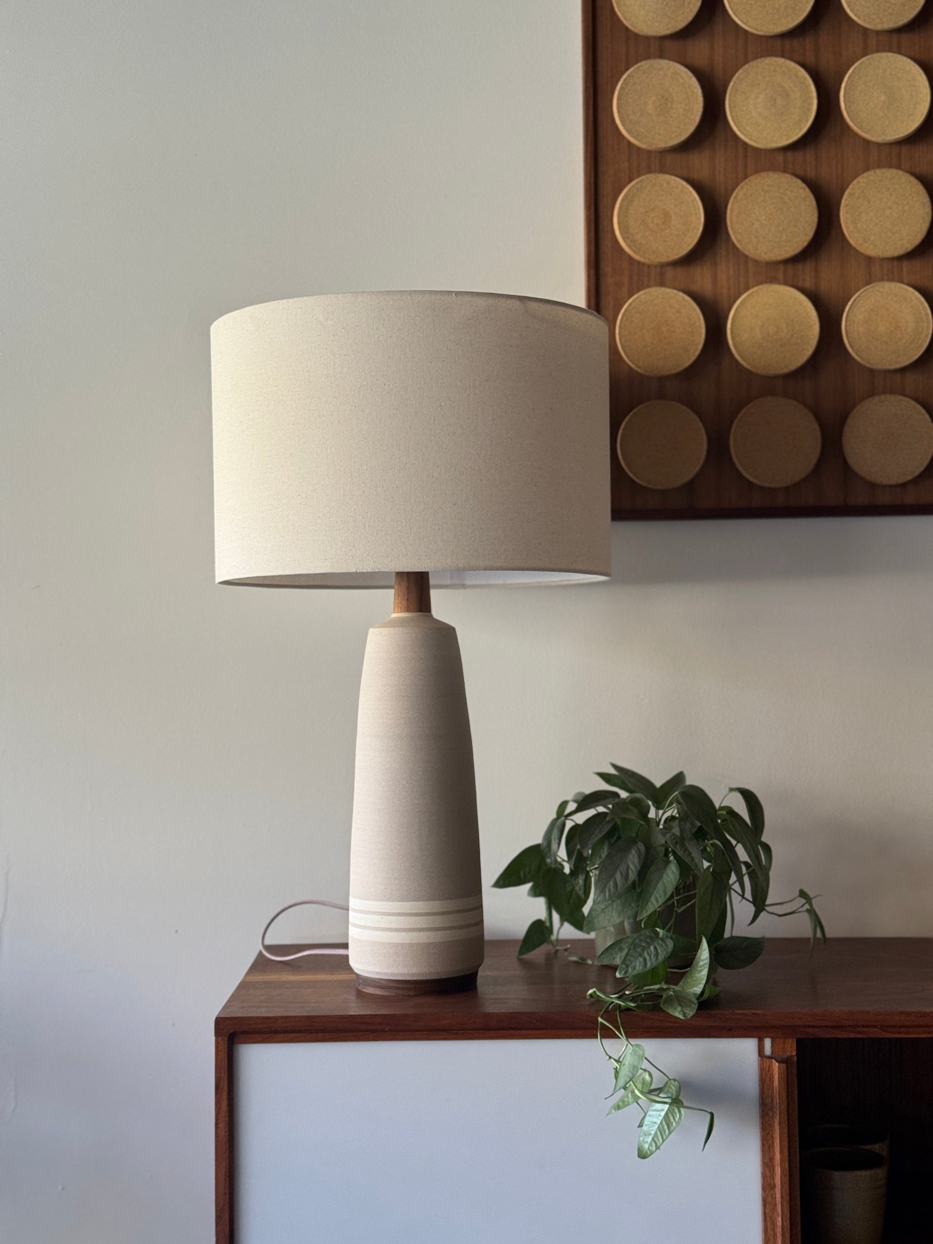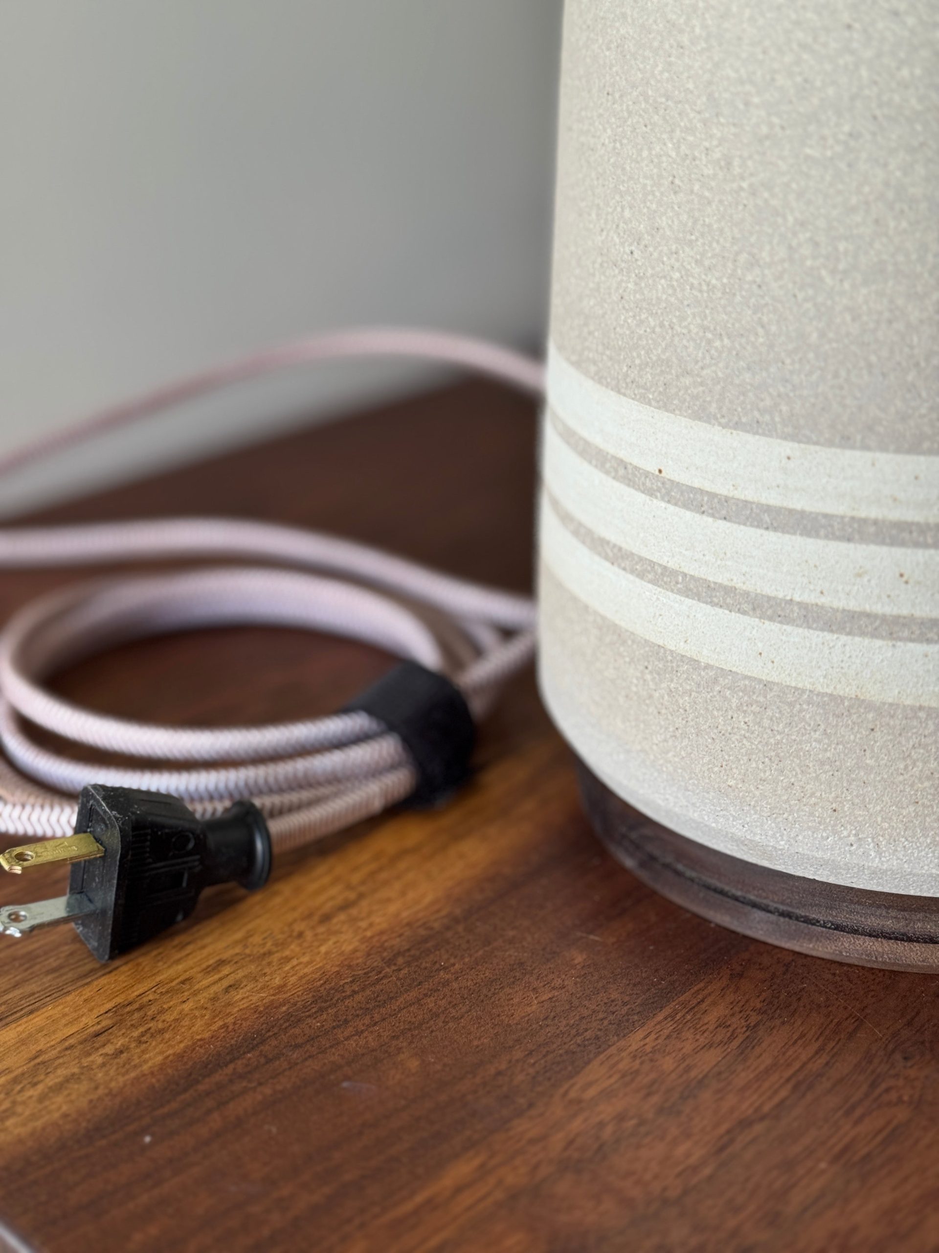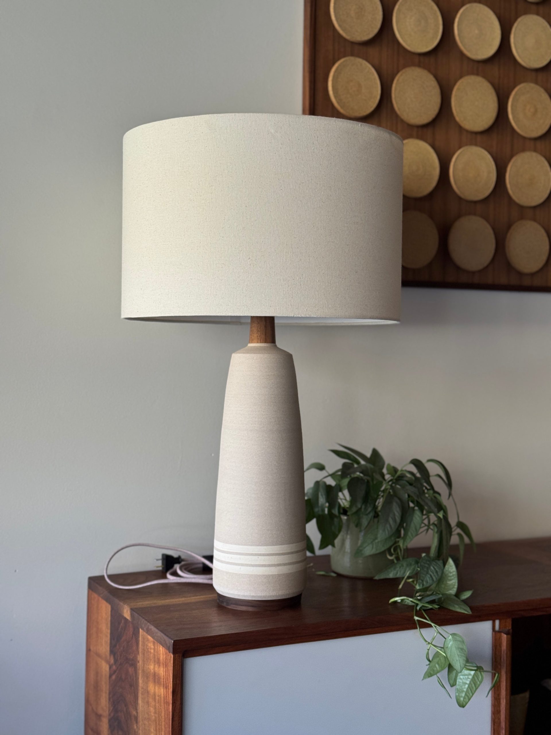 After some feedback requesting taller lamps, we crafted this extra tall table lamp. Sculptural and modern, this lamp features soft curves and a detailed walnut neck and base. The white stripes add a Fenway touch, from our Dearborn line.